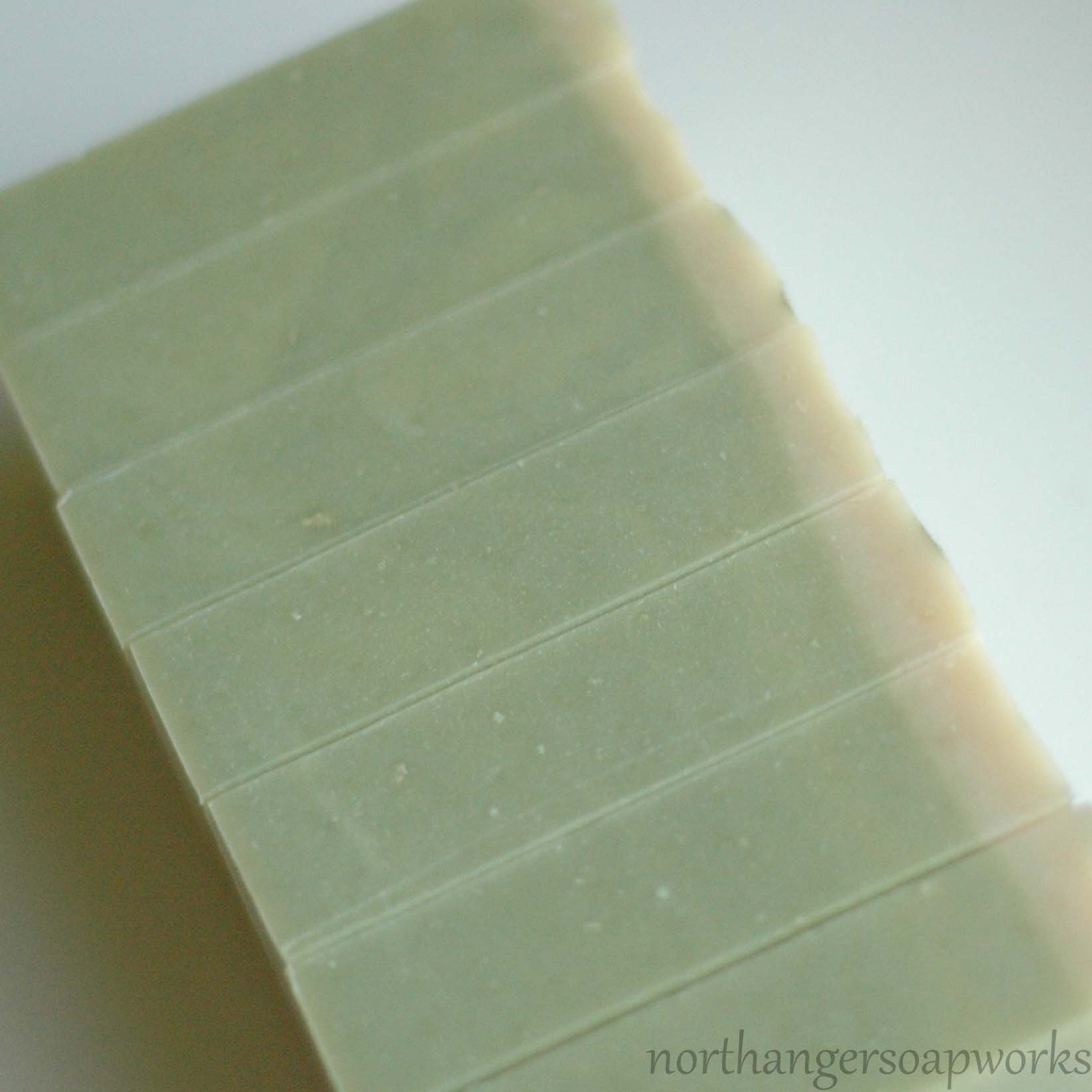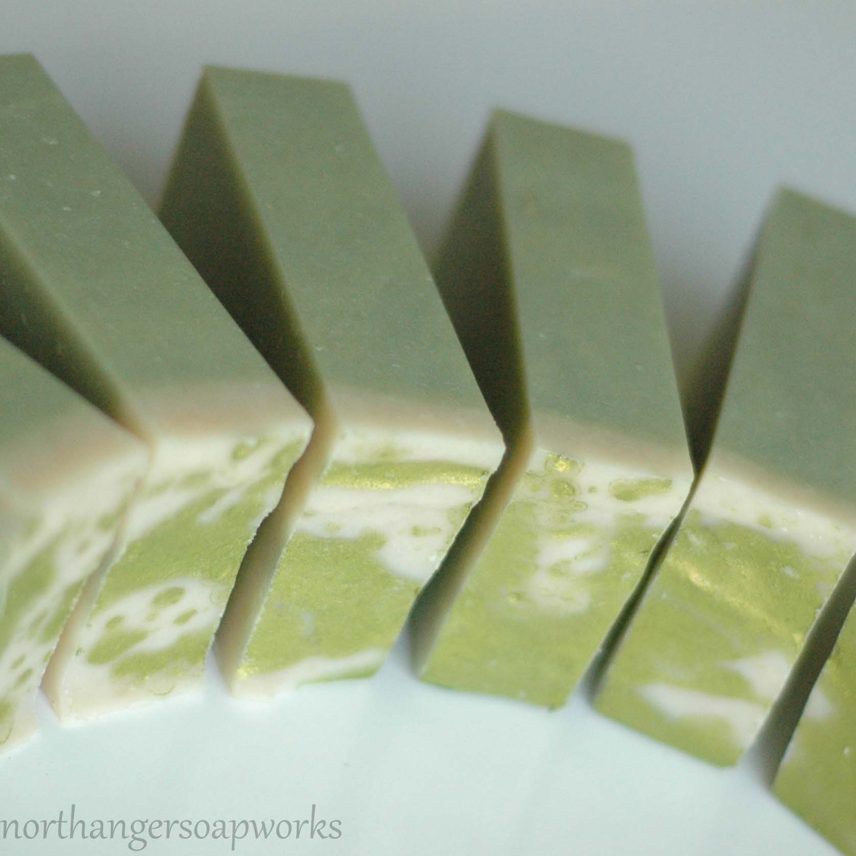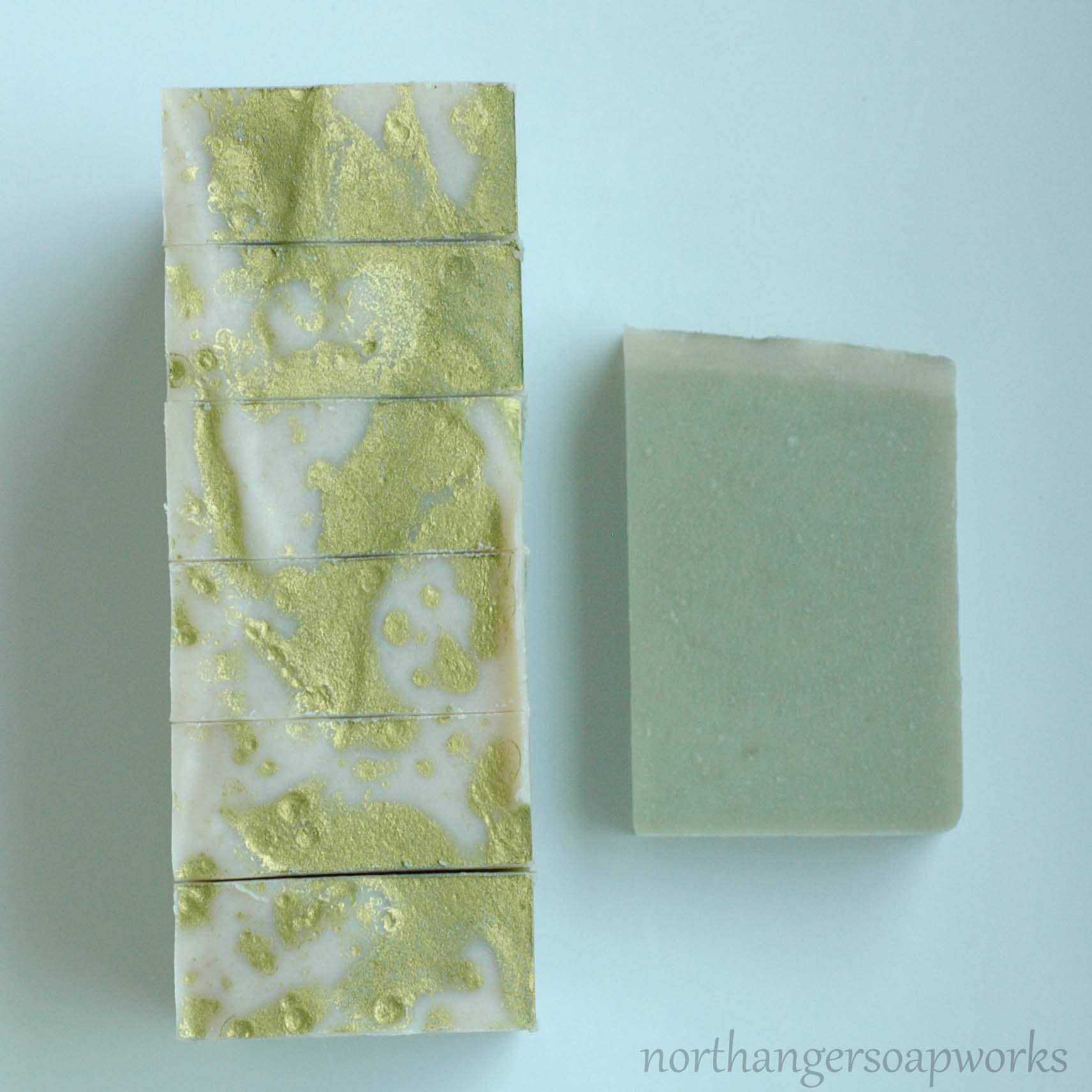 The soap is the color of moss and topped with a sparkly finish.